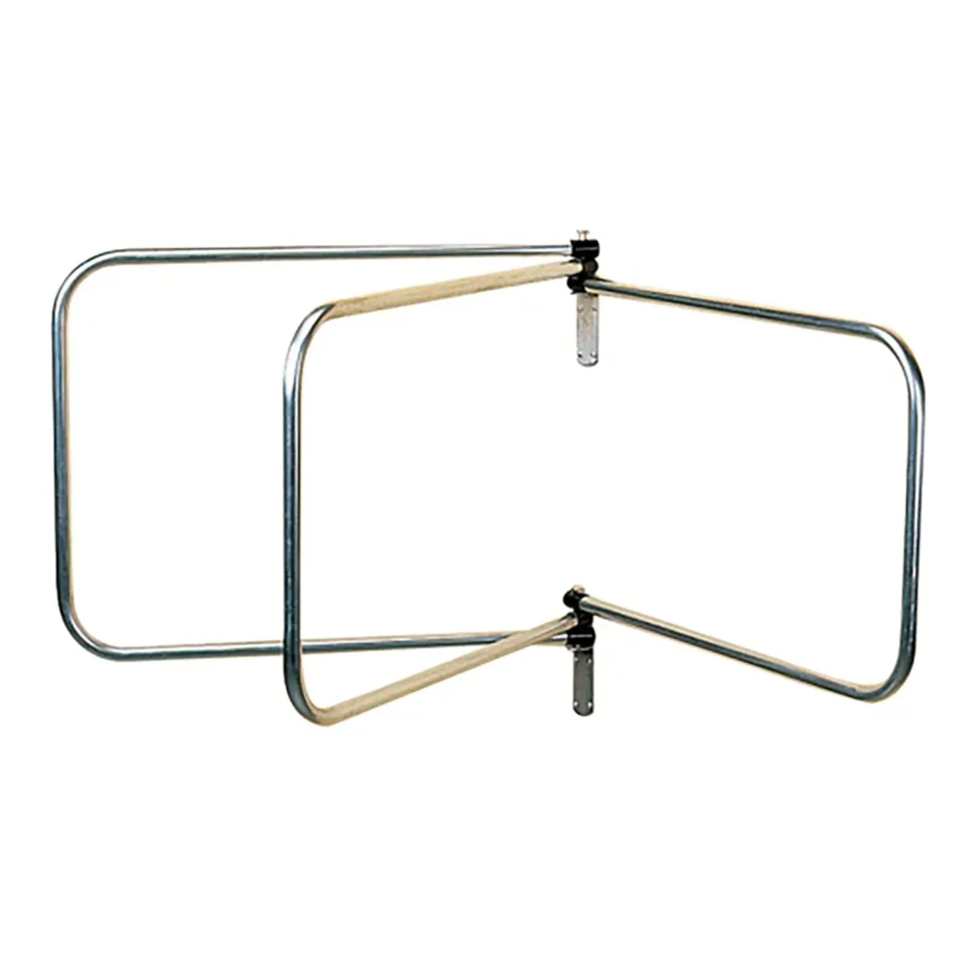 This rug rack folds flat against wall when not in use. Strong tubular construction with two wall fixing brackets. Height 74cm, width 5cm and projection 94cm.